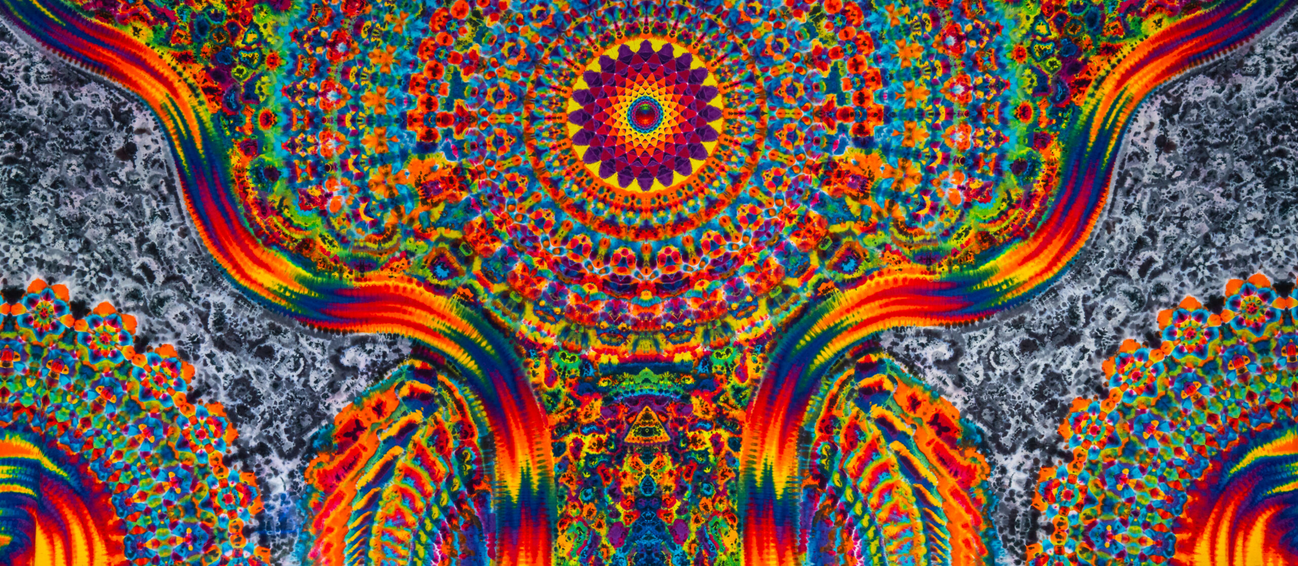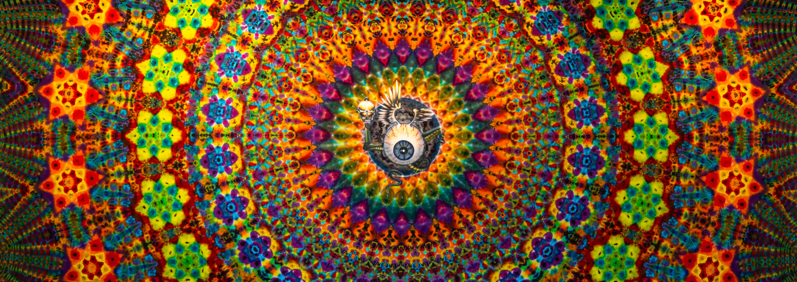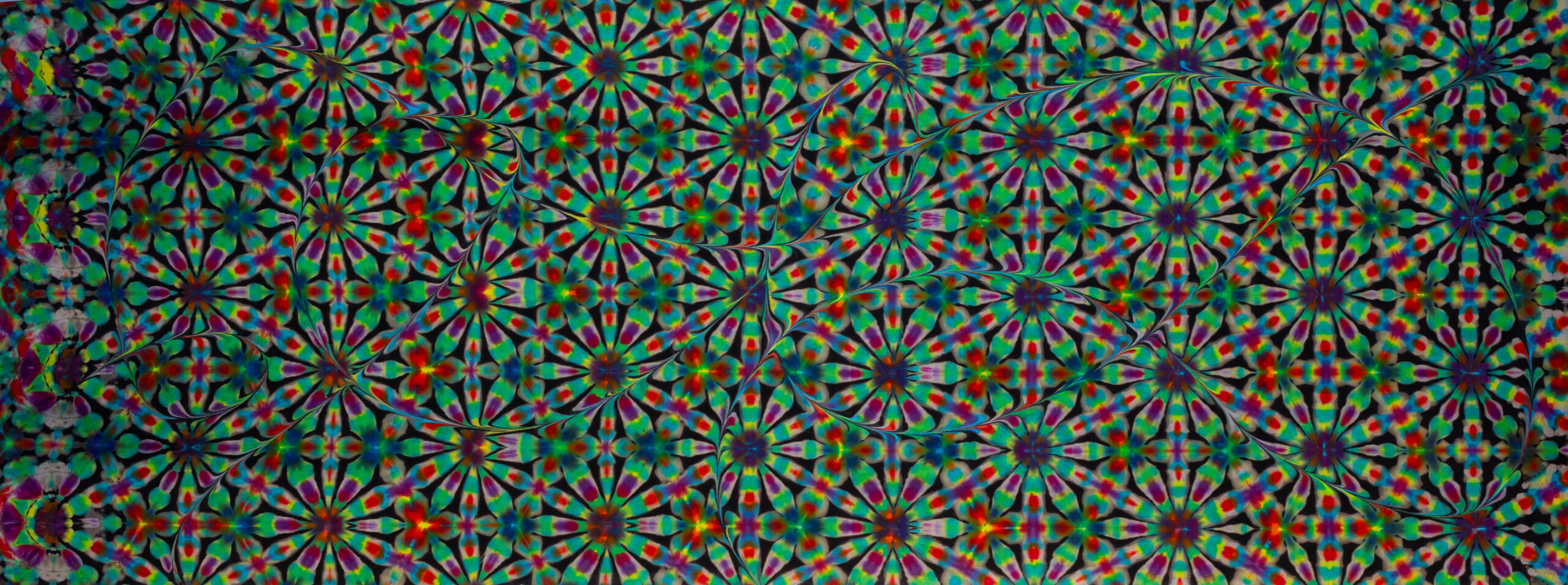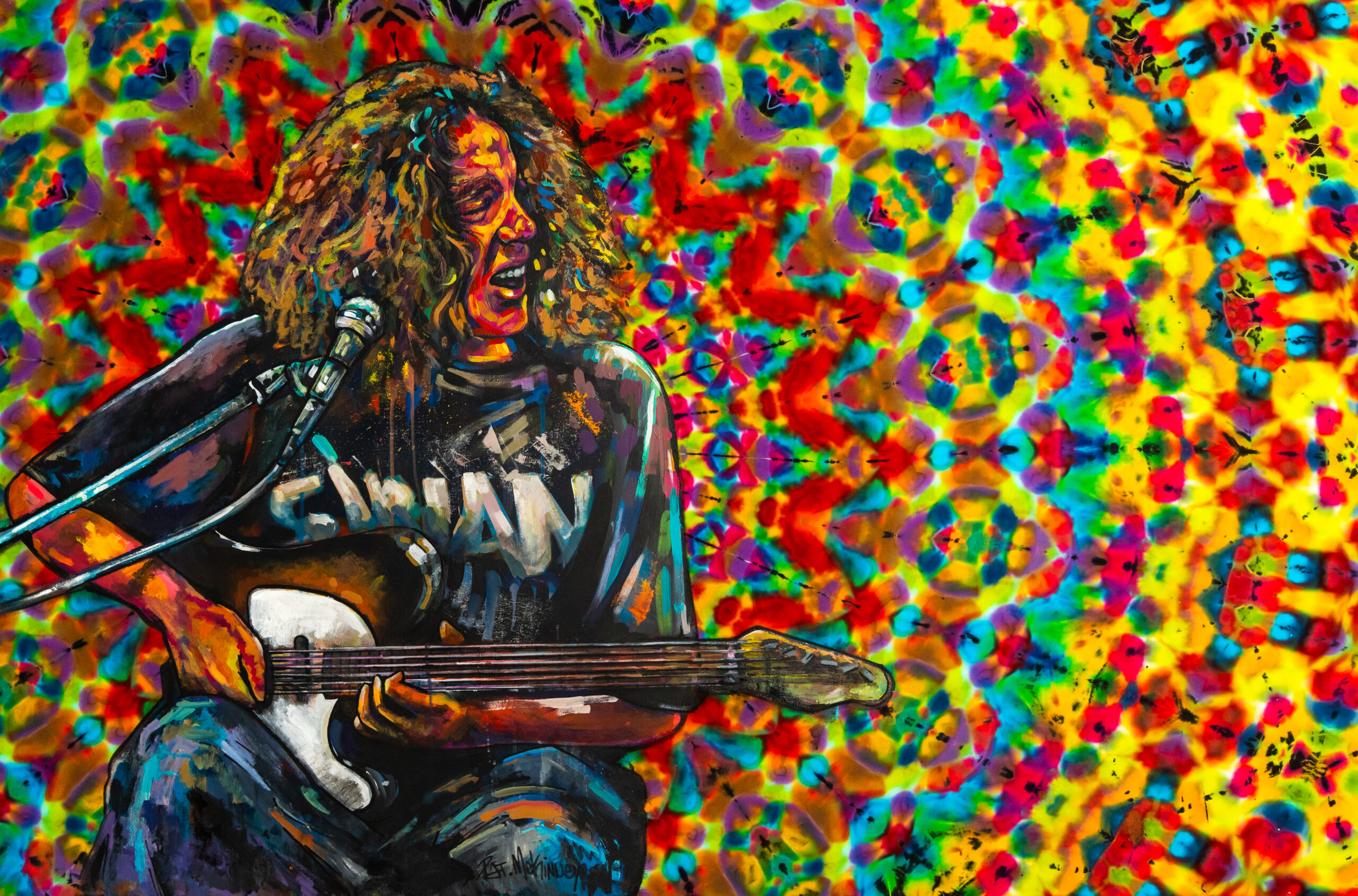 Harry’s art is influenced by the geometric patterns he finds in nature, from the spirals of seashells to the fractals in plant life. His connection to the natural world, combined with a deep love for time spent outdoors, provides endless inspiration for his vibrant, psychedelic designs. His momentum has only grown, with his pieces now displayed at every Widespread Panic show so since February 2025 — four works in their collection—a testament to his growing recognition in the scene.